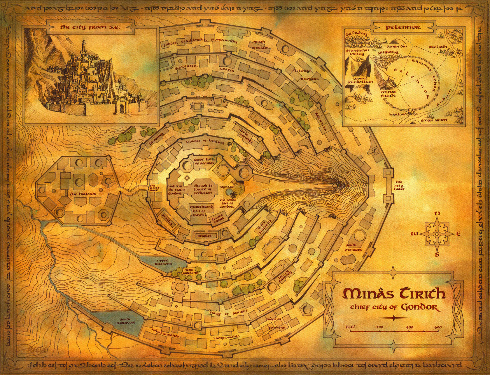 Vor Minas Tirith selbst liegen die Felder des Pelennor, ein fruchtbares Land mit vielen Höfen, das im Ringkrieg eine bedeutende Rolle spielte. Der Pelennor wird durch Rammas Echor, einer Außenmauer, geschützt, und im Süden grenzt er an den Anduin, wo der Hafen Harlond liegt.