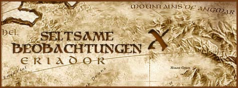 Ja, viele Jahre war es ruhig um die Ruinen von Carn Dûm gewesen. Nicht einmal der Gesang der Vögel vermochte die Gegend um die Feste herum mit Leben erfüllen. Doch heute, am 7ten Juli des Vierten Zeitalters, war es anders. Dunkler, schwarzer Rauch stieg aus den Ruinen empor und hing wie finstere Wolken in dem Gebirge. Dumpfes Klopfen, welches von den Hängen der Berge zurückgeworfen wurde und die Gegend in einen unheilverkündeten Rhythmus tauchte. Eine Gänsehaut erfasste die sonst so wagemutigen Waldläufer. Man beschloss, das nahegelegene Bruchtal über diese Entdeckung zu informieren um zu beraten, was dieses Vorgehen bedeuten könnte. |