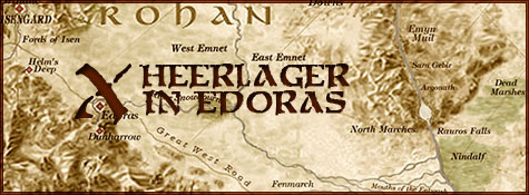 Aber es waren nicht nur die Gruppen, welche von Lorien nach Edoras gekommen waren und nun vor der Stadt ihre Lager errichtet hatten, sondern auch von Dol Amroth war erst ein Tag zuvor eine kleine Gesandtschaft in Edoras angekommen und auch sie hatten ihr Lager vor den Toren der Stadt errichtet. Und als ob Edoras nicht jetzt schon an seine Grenzen gestoßen wäre, traf auch noch der Schwesterneffe des Königs − Elfhelm − mit einem Teil seines Eoreds in Edoras ein. Man konnte beinahe den Eindruck bekommen, dass die Anzahl der Personen in den Lagern vor der Stadt, die Bewohner von Edoras um eine Vielzahl überstieg. |